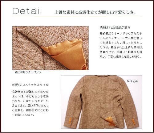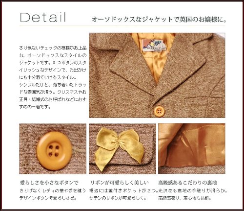 子供服ブランド女の子。子供服でも大人顔負けのデザイン。 子供服 キッズ ジュニア女の子用。さり気ないチェックの模様がお上品な、オーソドックスなスタイルのジャケットです。 3つボタンのスタイリッシュなデザインで、お出かけにも十分着ていけるスタイル。ポケットは蓋付きで、サテンのリボンを付けているのが可愛いポイント。胸にもポケットがあり、プリンセスライン入りの美シルエットの本格的な仕様。 (ポケット口が高級仕立ての仮止めしてありますので、ご着用の前にお切り下さいませ。)裏地はリボンとお揃いのピンクのサテン生地で、ブロック上にステッチが入っているのが細部までの拘り。やや厚手の滑らかな裏地がついていて、着心地満点です。お揃いのパンツと合わせればちょっとしたフォーマルスーツにも。子供のお誕生日やクリスマスプレゼントにぜひどうぞ。素材:表地:コットン65%、ポリエステル35%です。裏地:ポリエステル100%です。
