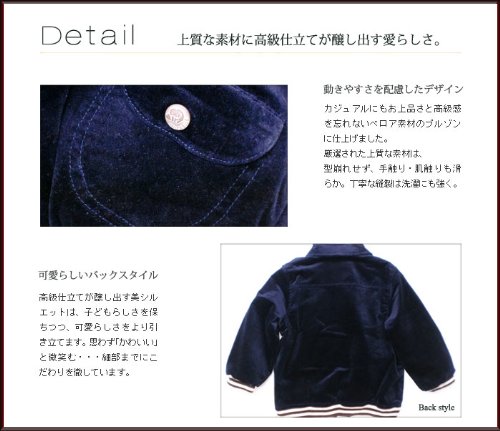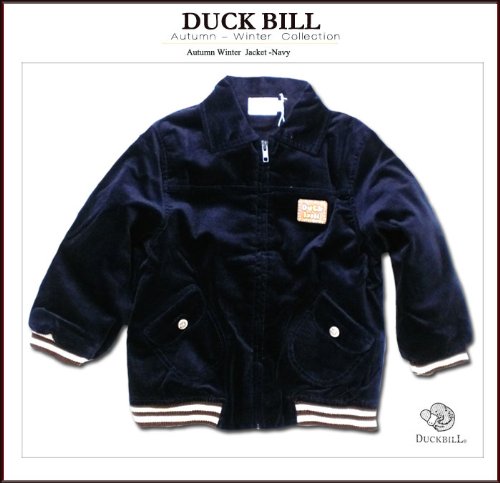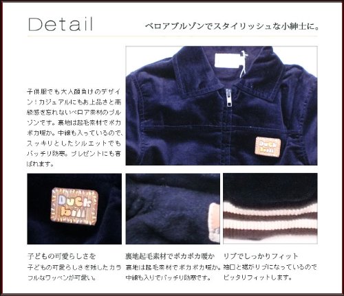 カジュアルにもお上品さと高級感を忘れないベロア素材のブルゾンです。裏地は起毛素材でポカポカ暖か。中綿も入っているので、スッキリとしたシルエットでもバッチリ防寒です。着脱はファスナーでラクラク。袖口と裾がリブになっているのでピッタリフィットします。ポケットはカモノハシ君のボタンがついた可愛らしいシルエット。胸元にはポップでキュートなダックビルのロゴワッペンが付いています。胸元に切り返しラインが入っているのもオシャレです。七五三お祝い、クリスマス、お誕生日プレゼントに喜ばれます。素材:表地はコットン100%、中綿はポリエステル100%、裏地はコットン100%です。