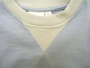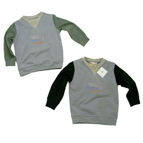 真夏以外のシーズンに活躍しそうな、程よい厚さのトレーナーです。2タイプのデザインで、一つはシンプルなワンカラー、もう一つはオシャレな重ね着風のツートーンになっています。襟はしっかりとしたリブ編みのラウンドネック。その下にステッチと別布でVネック風のデザインが施されています。胸元にはダックビルのシンプルなロゴとお星様のカラフルな刺繍がオシャレです。生地はサラッとしたパイル生地になっています。素材:コットン97%+スパンデックス3%