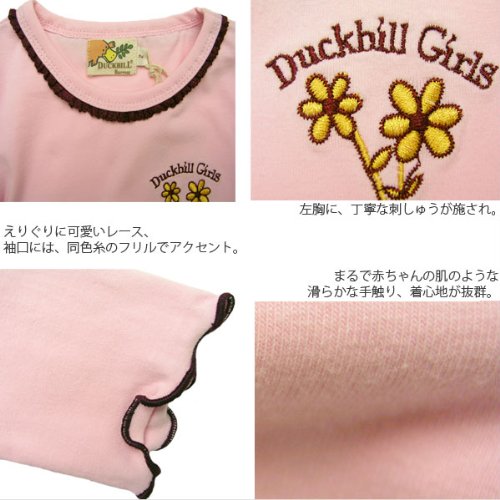 伸びよく程よい厚さの生地で、えりのフリルが可愛いニットカットソーです。襟もとに沿って、可愛いレースでぐるっと一周を巻く、女の子らしいスタイル。程よくフィットするので気持ちの良い着心地です。胸元にはダックビルのロゴとかわいいお花をお上品に刺しゅう。柔らかい生地なので重ね着にも最適です。秋から春まで長く着られます!コットン95% ストレッチ素材5%です。