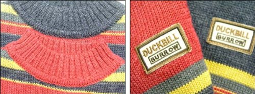 モノトーンになりがちな冬のコーディネートに嬉しいカラフルなセーターです!派手過ぎない渋めな色合いがちょうど良いです。身頃と袖にマルチカラーのストライプ模様があって、一枚着るだけでもパッと華やぎます。ストライプ部分は、編み方を途中で変えて段差が出るように編まれています。胸元にはダックビルのロゴ入りのタグが付いて可愛いですよ!襟・袖口・裾がリブ編みになっているのが嬉しいですね。ぴったりフィットして暖かいです。素材:アクリル70%+ウール30%