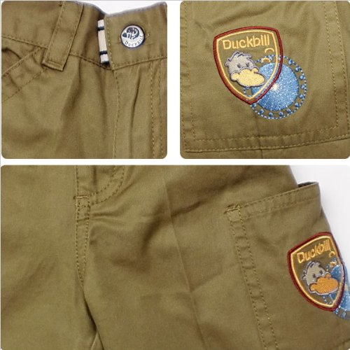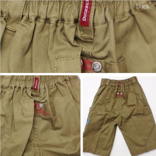 元気にお外で遊ぶなら、やっぱり欲しいのは動きやすいハーフパンツ。シンプルでほど良い厚さのスタイルなら元気なお子様にもピッタリです!ポケットは前とサイドの計4つ。サイドポケットにはカモノハシ君のワッペン風刺繍が入って格好いいです!お尻にはタグ風デザインでダックビルのロゴがワンポイントに。カモノハシ君が彫られたビンテージ調のボタンやスタッズも素敵です。ウエストは半ゴムで、生地はストレッチがあるので快適な履き心地。春夏秋物。素材:コットン100%