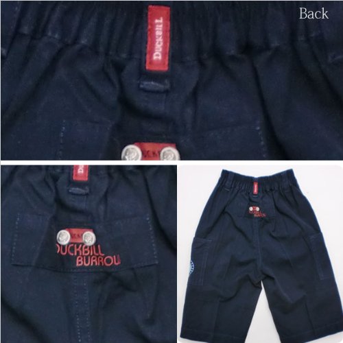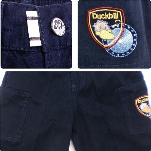 元気にお外で遊ぶなら、やっぱり欲しいのは動きやすいハーフパンツ。シンプルでほど良い厚さのスタイルなら元気なお子様にもピッタリです!ポケットは前とサイドの計4つ。サイドポケットにはカモノハシ君のワッペン風刺繍が入って格好いいです!お尻にはタグ風デザインでダックビルのロゴがワンポイントに。カモノハシ君が彫られたビンテージ調のボタンやスタッズも素敵です。ウエストは半ゴムで、生地はストレッチがあるので快適な履き心地。春夏秋物。素材:コットン100%