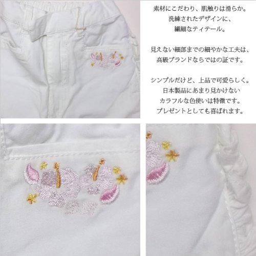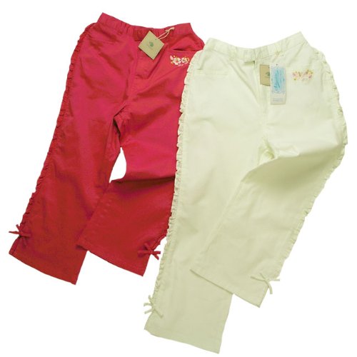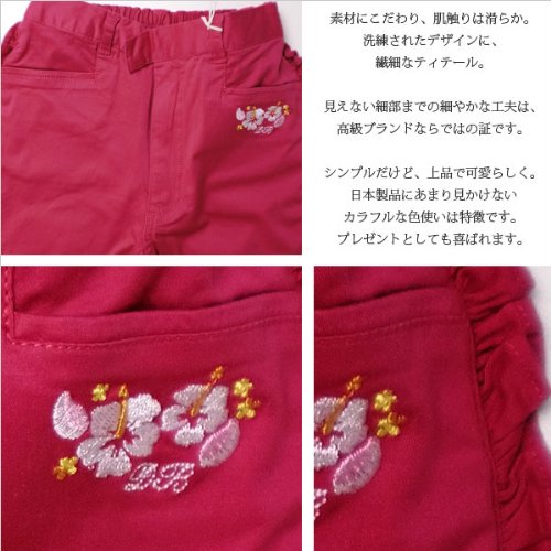 鮮やかな色が目を引くカラーパンツです。 両サイドに細かなフリルが施された女の子らしい一枚。 ストレートスタイルの裾にはリボンとスリット入り、サンダルとの相性もバツグンです。 左ポケットにはハイビスカスのワンポイント刺繍入り。 控えめなのでちょっぴり大人なデザインです。 生地は横伸びに優れていますので着心地も楽々♪ 一味も二味も違う上品で可愛いインポートブランド子供服は、お誕生日プレゼント、ギフト贈答品に喜ばれます。素材:コットン97%+スパンデックス3%