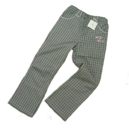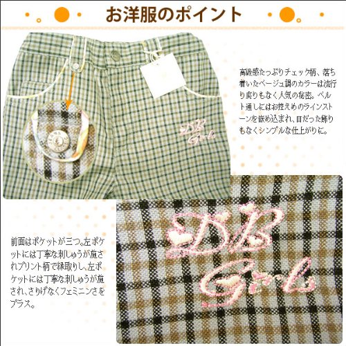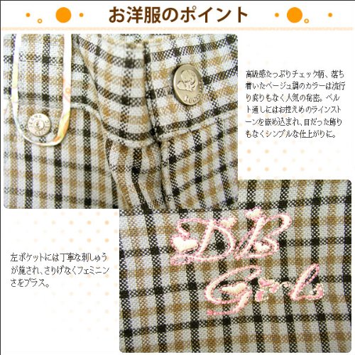 キュートさとカッコ良さを欲張りたい女の子必見!落ち着いたチェック柄の生地を使ったデザインパンツです。ポケットは前後合わせて4つ。前ポケットは角丸スタイルにギャザーを寄せた立体感のあるデザイン。すそ辺には、甘いカーブを描いた切り替え、それに沿ってバイヤスを重ね。ウエストは半ゴムになっていて、スナップボタンで留めているので着脱も楽です。普段着からちょっとおでかけまで、幅広く使えちゃうのも嬉しいです。 秋冬物。素材:コットン(綿)100%です。