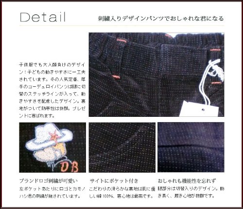 厚手のしっかりとした生地のコーデュロイパンツです!真っ直ぐ伸びたワイドストレートなシルエット。シンプルなスタイルはカジュアルにもフォーマルにも使いまわせる優れモノ。ポケットはお尻と前に二つずつ。左のポケットにはカモノハシ君がにっこり。ダックビルの頭文字が入った刺繍があって、上品でカッコウイイ!腿と膝のラインに切り返しが入っていて、動きやすさを配慮したおしゃれなデザイン。その上、防寒性に嬉しい裏地付き。もちろん素材は綿100%です。お誕生日プレゼントにも喜ばれます。