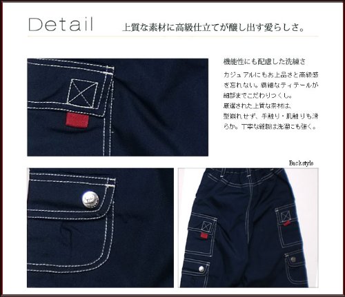 しっかりとしたコットン生地のハーフパンツです。ダークカラーの生地に、明るい糸のステッチが可愛いです♪左右に3つずつ、合計6個のポケットがついたやんちゃデザイン!二段目のポケットはマジックテープのフタ、三段目はスナップボタンのフタが付いています。大好きなものを詰め込んでお出かけできますね。パンツ裾はゴムで絞ることができるので、お好みに合わせて調節してみてくださいね! ウエストは半ゴムになっています。 春夏物。素材:コットン100%