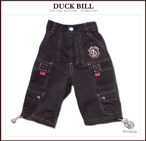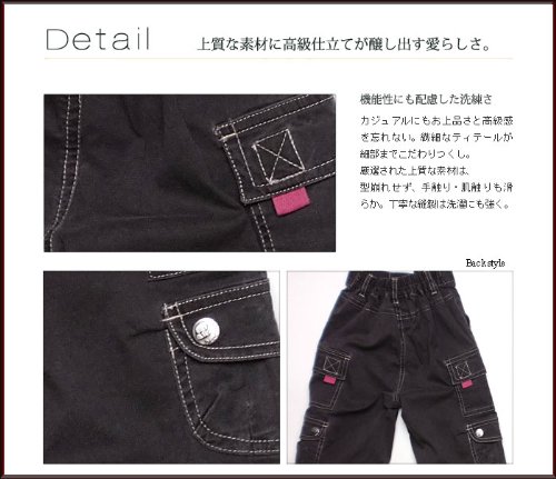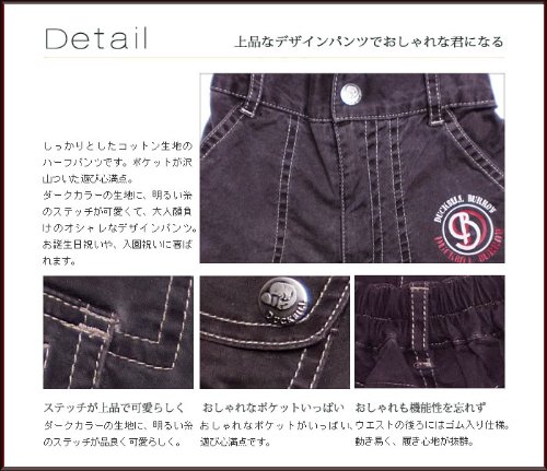 しっかりとしたコットン生地のハーフパンツです。ダークカラーの生地に、明るい糸のステッチが可愛いです♪左右に3つずつ、合計6個のポケットがついたやんちゃデザイン!二段目のポケットはマジックテープのフタ、三段目はスナップボタンのフタが付いています。大好きなものを詰め込んでお出かけできますね。パンツ裾はゴムで絞ることができるので、お好みに合わせて調節してみてくださいね! ウエストは半ゴムになっています。 春夏物。素材:コットン100%