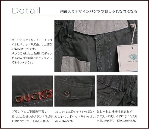 オーソドックスなストレートスタイルにポケットが沢山ついた遊び心満点のカジュアルパンツです。ポケットは全部で7つもついていて、お尻のポケットと足両サイドのポケットには物が落ちないようにフタがついています。ウエストはフックボタンで留めるようになっていて、その上にはマジックテープで止める別生地の帯がついているので、まるでベルトをつけているような感じです!パンツの裾には二色使いのダックビルのロゴが刺繍されていてとってもオシャレ。(素材は同じコットン100%ですが、生地の織り方が異なるため違った質感になっています。)※裾の上付近に、穴の閉じたボタンホールがありますが、これはデザイン上のものです。春夏物。
