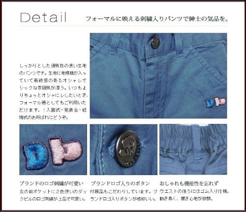 落ち着いたグレイッシュな色が印象的なパンツです。たくさん遊んで活発に動き回る季節には、いくつあっても困らないものです!ポケットは前2つ、後ろ2つの計4つ!ウエストは半ゴムになっているので着脱も簡単です。Duckbillのマークと文字入が入った金属のボタンと、落ち着いた色合いで上品さを演出する一方で、 前のポケットに施されたポップな色合いと字体の刺繍が、子供らしさを残したデザインに仕上がっています。コーディネートの組み合わせに悩む心配もありません♪春夏物。素材:コットン100%