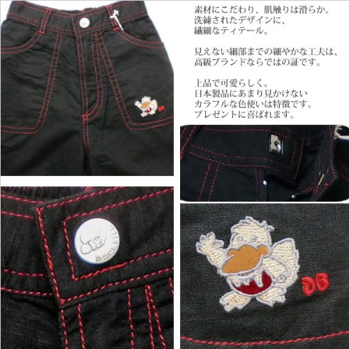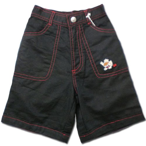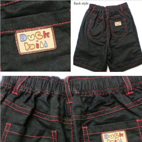カラフルゴロが可愛く目立つショートパンツです。見た目には落ち着いた色、そして柔らかくて軽い肌触り。春~初夏にピッタリのオシャレなこのショートパンツは、生地のシックさとは反対に、鮮やかカラーで光沢のある糸を使ったステッチが良く目立って可愛いです!左ポケットにはカモノハシ君とダックビルの頭文字を丁寧に刺繍。刺繍の中には別生地を丁寧に縫いつけてあって立体感タップリ。裾が折り返したデザインになっているので、ちっちゃいお子様の可愛らしさがさらに引き立ちます。春夏物。素材:ネイビーは麻55%+レーヨン45%。