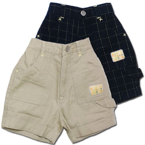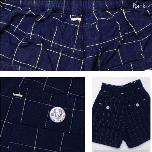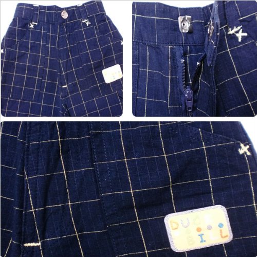 イキナチェック柄のショートパンツ。 紺を基調にした薄手のマドラスチェックとイエロー色のステッチが見事に調和したデザイン。全体的に、落ち着いたマドラスチェック、両サイトの甘いカーブのポケットと裾の折り返しがちょっぴり生意気。ウエストは両脇からゴムになっていることで機能性面も充実。春夏物。素材は棉100%です。