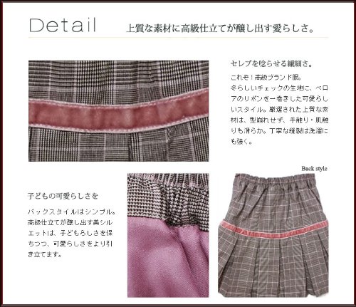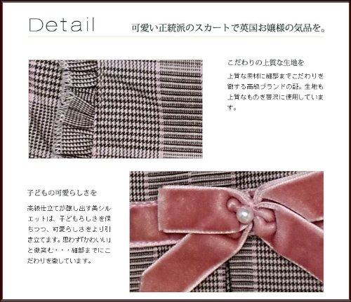 輸入子供服女の子ブランドお上品なオーソドックスな英国お嬢様スカート。 冬らしいチェックのスカートに、ベロアのリボンを一巻きした可愛らしいデザイン。リボンを結んだところには、一粒のパールビーズを添えてお上品な仕上がり。リボンがちょうど切り返しになっていて、その上には2本のフリルが並びます。ウエストは半ゴムになっているので履き心地はラクラク。着脱は左にあるファスナーになります。スカートの裾にはダックビルのシンプルなロゴタグ入り。高級感ある光沢裏地が付いていますので防寒にも優れ、寒い季節に重宝します。可愛いインポートブランド子供服は、クリスマスパーティやプレゼント、ギフト贈答品に喜ばれます。秋冬物。素材:表地:コットン95%+スパンデックス5% 裏地:ポリエステル100%
