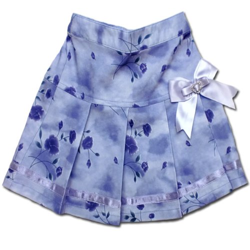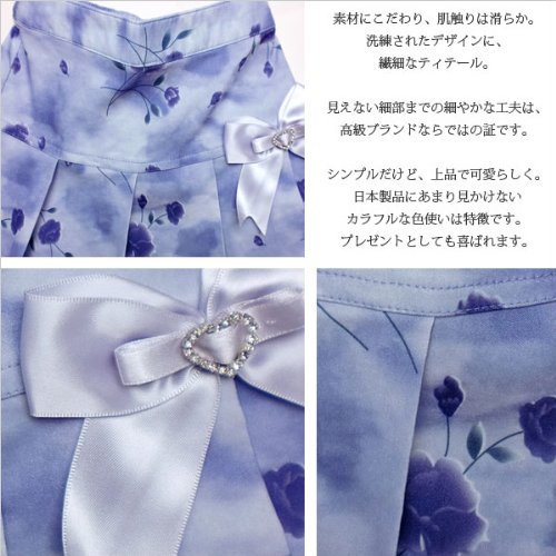 エレガントなお花模様のプリントがお嬢様らしいスカートです。プリーツスタイルでちょっぴりカジュアル思考のデザイン。裾にはサテンリボンを巻いてゴージャス感たっぷり!プリーツの切り替えしラインに、サテンのリボンとキラキラ輝くラインストーンのハート♪スイートな雰囲気で春にピッタリです。ウエストは半ゴムになっていて、生地にはストレッチも利いているので履き心地は楽々! 春夏物。素材:アクリル95%+スパンデックス5%