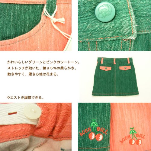 不規則なうねのカラーデニム素材がおもしろいタイトスカートです。渋めのカラーにさし色でアクセント。前ポケットや、ベルト通しが同じなのでワンポイントで目立つ、単調にならないようにデザインされています。すそにはさくらんぽの刺しゅうがキュートさアップ。生地は横ストレッチがあるので動きにフィットした履き心地。前開きワンタッチのドットボタンとファスナー。ウエストには調整が可能のアジャスターがついて動きやすさが計算されています。真冬を除く、秋から夏までスリーシーズンに活躍してくれるマルチアイテム。素材:コットン95%、スパンデックス(ストレッチ素材)5%。