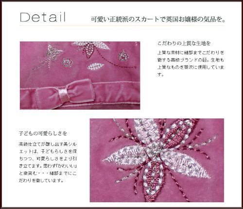 輸入子供服女の子ブランドお上品なオーソドックスな英国お嬢様スカート。高級感あるベロア素材が光の加減によって沢山のニュアンスを見せてくれる、大きめボックスプリーツのスカートです。光沢のあるベロアは、それだけでも高級感たっぷり。冬に大人気の素材です。プリーツの切り替えし上にはビロードのリボンが巻かれていて女の子らしい仕上がりになっています。着脱は左にファスナーとスナップボタンがあるので、センターはスッキリと綺麗なシルエット。光沢のある糸でお花と蝶々も刺繍してあります。裏地は付いていませんが、生地がしっかり厚いので透けることはありません。日本製品にはあまり見かけないカラフルな色使いが魅力。秋冬物。素材:コットン100%