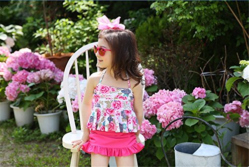 「楽々セレクトショップ」DUDU&MUMU正規品 可愛い子供用水着 女の子 花柄 スクール セパレート 上下セット 女児 ガールズ ビキニ キャップ付き 海水浴 スイミング ベビー フリル スカート 帽子付き お誕生日プレゼント 出産お祝い 幼稚園用 (90, ピング+花柄)