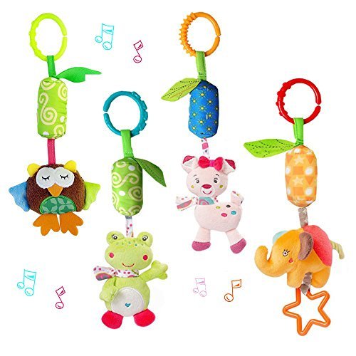 Daisy 4個入り 乳幼児用フラシ天・愛らしい動物 車のシート吊下げガラガラおもちゃ 子供ベビーカー・ベビーベッド乳母車装飾 ウィンドチャイム・スクイーク付きベルパペット