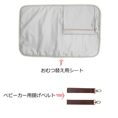 - 付属品:おむつ替え用シートとベビーカー用提げベルトと長さ調整可能なショルダーストラップが付いています。おむつ替え用シートにはジッパーポケットがあり、ウェットティッシュやおむつなどを入れることができます。