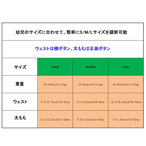 - 調整可能なスナップボタンが付いて、幼児のサイズに合わせることができ、脱ぎ着も楽になります。