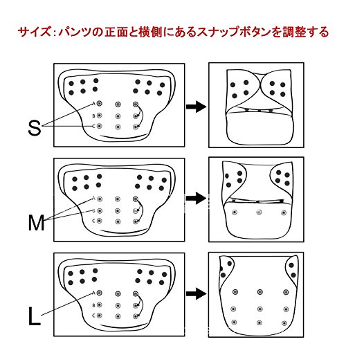 パンツの前面と横にスナップボタンが付きで、ウェストは横ボタン、股上は前面ボタンで、簡単にS/M/Lサイズを調整できます。