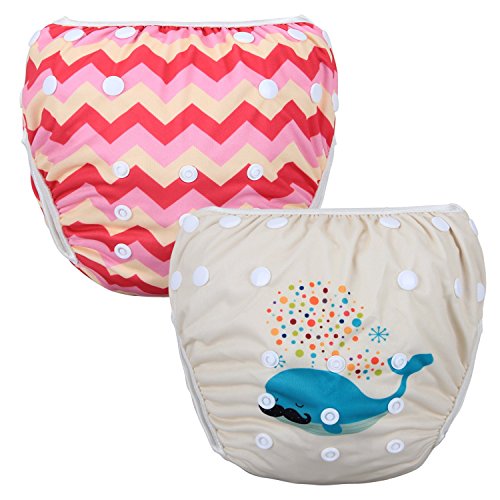 Teamoy 水遊びパンツ 2点セット 0-2歳赤ちゃん用 ボタンでサイズ調整可能 防水外層 ポリエステルメッシュ内層 スイミング教室・公園・海水浴・温泉旅行(鯨+ピンク波)