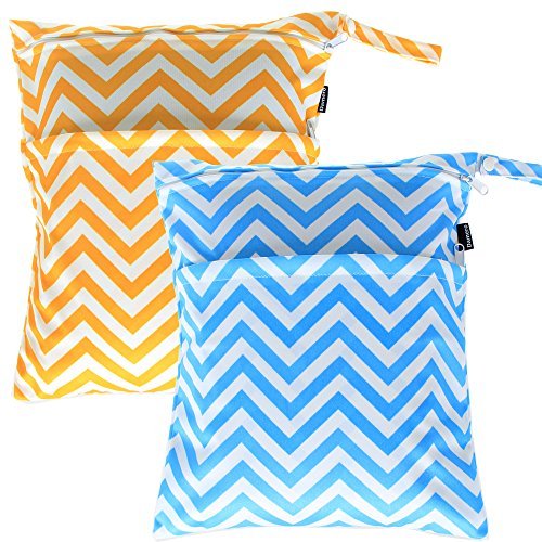 Damero ウェットバック(防水バッグ) 可愛い 2点セット オムツ・着替え・タオル・水着・お風呂用品・食事セット マルチ収納 温泉 スポーツジム ショッピングモール 大活躍(M,黄色波+青波)