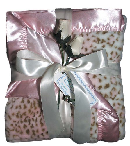 Pink polyester, Faux Fur Lynx receiving blanket with a 2 inch satin embroidered trim, and satin backing. Tied with a ribbon and wooden flower accents.
