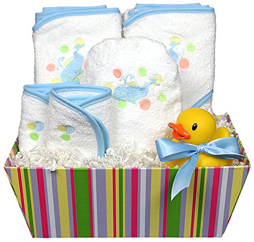 7 piece 100% cotton terry cloth bath set: 1 container 2 hooded towels 1 bath mit 2 wash clothes 1 rubber duckie Blue