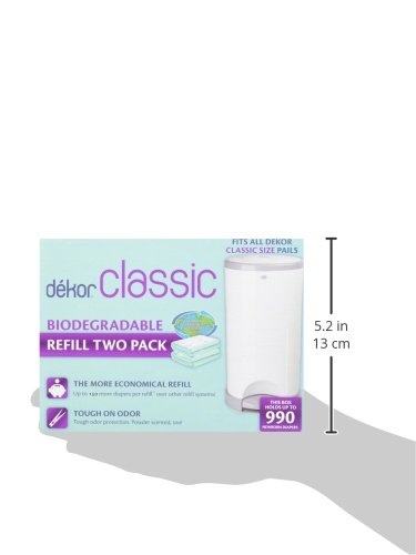 Fits all Dekor Classic size pails.;Recyclable, biodegradable and easy to use.;Unlimited shelf life offer great capacity.;Each refill/bag liner holds up to 240 diapers (based on newborn size).;2 boxes per pack of these convenient green liners.