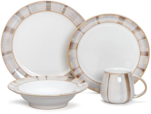 From 200-year-old stoneware company Denby, 4-piece place setting; with service for 1;Includes 11-inch dinner plate, 9-1/2-inch dessert/salad plate, wide-rimmed 9-inch soup/cereal bowl, and 13-ounce large mug;Vitrified stoneware construction; wide-brim plate and bowl borders and mug exterior feature hand applied glaze design of vertical stripes in soft brown and cream; white-glazed interiors on all pieces;With replacement policy for construction defects; online registration program offered to alert users a year in advance of pattern discontinuation plans;Dishwasher-, microwave-, oven-, and freezer-safe with some precautions; made in Derbyshire, England