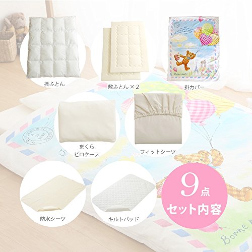 - 微妙な色合いを見事に仕上げた、水彩画のように鮮やかなカバーです。 赤ちゃんのかわいさを引き立てる仕上がりになりました。 掛ふとんは中綿をたっぷり詰め込むことで、ふんわりとしたかさ高で身体をやわらかく包み込みます。 敷ふとんは、保温性の高いフリース素材と、通気性抜群のハニカム素材の2枚セットで、季節に合わせて使い分けできます。 9点セット 掛ふとん 95×120cm 敷ふとん(×2) 70×120cm 枕 25×35cm 掛カバー 102×128cm フィットシーツ 70×120cm ピロケース 28×38cm キルトパッド 70×120cm 防水シーツ 70×120cm