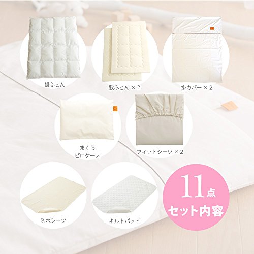 - ベビーふとん11点セットです。 掛ふとんは表地と裏地の間に「マチ」を作り中綿をたっぷり詰め込むことで、 ふんわりとしたかさ高で、身体をやわらかく包み込みます。 敷ふとんは、保温性の高いフリース素材と、通気性抜群のハニカム素材の2枚セットで、 季節に合わせて使い分けできます。 この敷ふとんは1枚ずつ洗え、より清潔にご使用いただけます。 掛ふとん 95×120cm 敷ふとん(×2) 70×120cm 枕 25×35cm 掛カバー (×2)102×128cm フィットシーツ(×2) 70×120cm ピロケース 25×35cm キルトパッド 70×120cm 防水シーツ 70×120cm