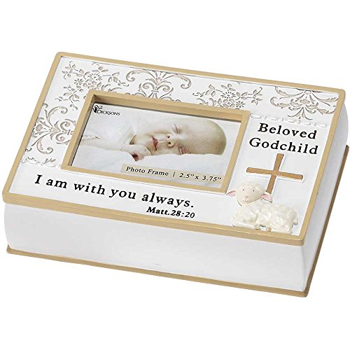 Godchild keepsake box is perfect for holding cards, small gifts and photos from baptism or christening;Has removable lid that can be personalized with a favorite photo cut to about 3 3/4 x 2 1/2;Made of resin; size is 7 long x 4 3/4 wide x 1 7/8 deep