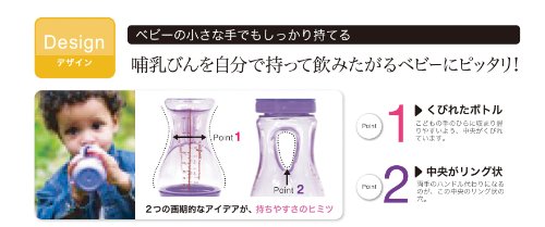 赤ちゃんの小さな手でも、しっかり持ちやすいようにデザインされたユニークな哺乳びん