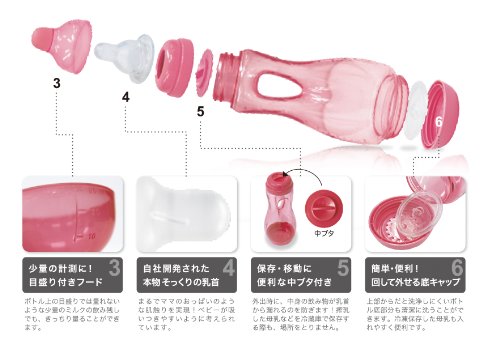 - [素材] フード:ポリプロピレン キャップ:ポリプロピレン 中ぶた:TPE ポリプロピレン 乳首:合成ゴム(シリコーンゴム) びん:ポリエステル 底パッキン:合成ゴム(シリコーンゴム) 底キャップ:ポリプロピレン