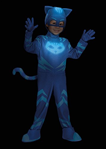 小さなお子様が設定されていることを希望する場合停止を悪いことと同様に近所でマイルドなaquaphobiaの場合、彼はだ完璧な候補をロールの猫の位置男の子、リーダーのPJのマスク彼を助ける雄大パスを始め、このデラックスPJのマスクCat男の子コスチュームを捕まえろ – ジャンプスーツw / attached bootカバーフード/マスク – Tail – 手袋1組