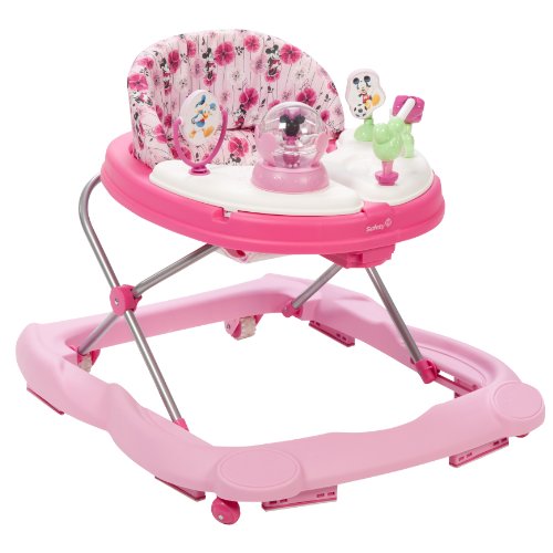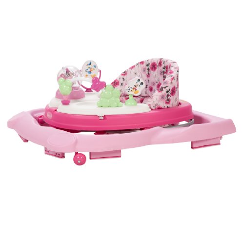 Sturdy wheels for floors and carpets and grip strips to reduce movement on uneven surfaces;Plays 12 songs and has 4 Minnie mouse and friends toys musical light up Minnie mouse, daisy bead rail, Donald spinner and mickey playing soccer;Features oversized snack and play area, 2 removable swing open activity trays, 3 position height adjustment, and machine washable padded seat;Folds quickly and compactly for storage and travel;Holds child up to 30 pounds child must be able to sit up unassisted