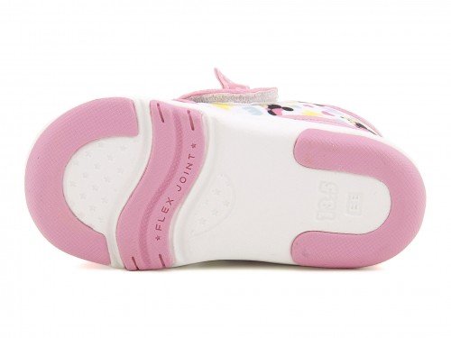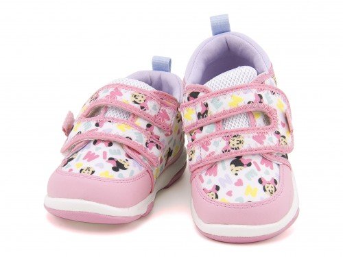 送料無料! 『Disney(ディズニー) ミニーマウス ベビーシューズ DN B1159 ピンク』 ミニーのポップゾーンイラストをプリントしたベビーシューズ☆ 大きな甲バンドタイプの面ファスナーで、脱ぎ履きラクラク♪ つま先はゆったり構造になっています。靴底は、足の曲がりと同じ位置で曲がる「フレックスジョイント」で、余計な負担をかけないデザイン◎。 中敷きは、取り外して洗えるカップインソールで、いつも清潔に保てます。13.5cm時、片足約75gの軽量設計です!※展開サイズ:キッズ