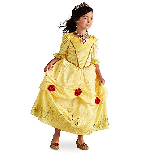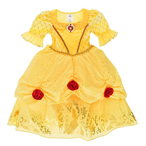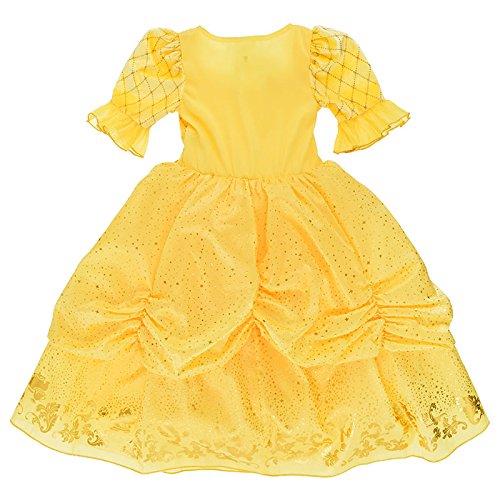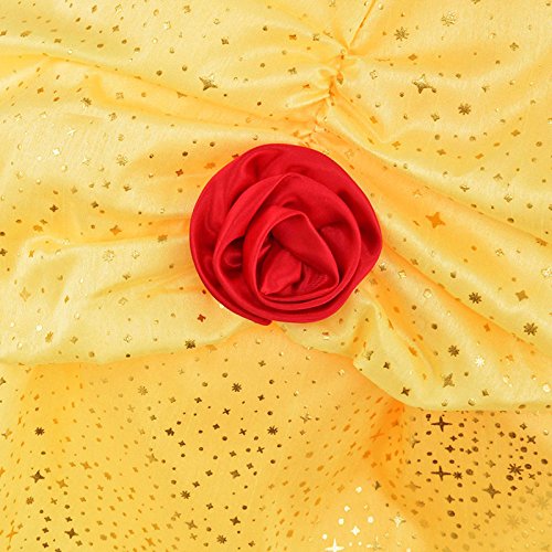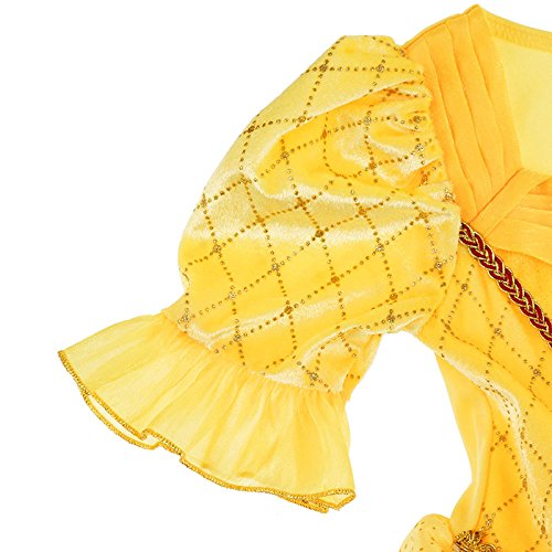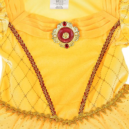 これであなたもディズニープリンセス・・☆パーティーや誕生日などのイベントにピッタリのベルのドレス。華やかなイエローに、ゴールドのプリント、赤いバラのコサージュなど、こだわりがギューっと詰まった1着です。ウエスト部分はゴム仕様なので、可愛らしいふんわりシルエットが生まれ、着脱もラクラク♪キラキラゴージャス気分を楽しんで♪