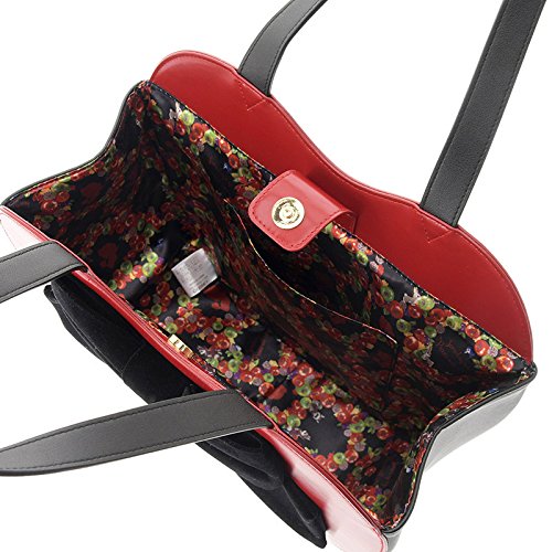 真っ赤でキャッチーな主役級トートバッグ。ボディの黒いベロアリボンが甘すぎないアクセント☆型押しのシルエットが上品。メルヘンかつエッジの効いた、内側の総柄プリントにも注目です★