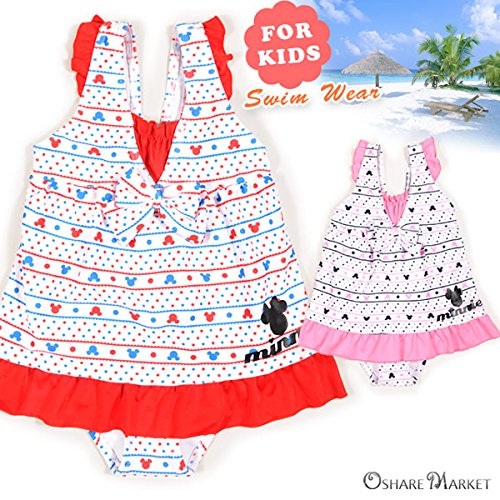 ミニーマウスの女の子用ブランド水着。ドット柄にミニーモチーフのボーダーを合わせたポップなアイテム。リボンやフリル使いが女の子らしいCUTEなデザインです