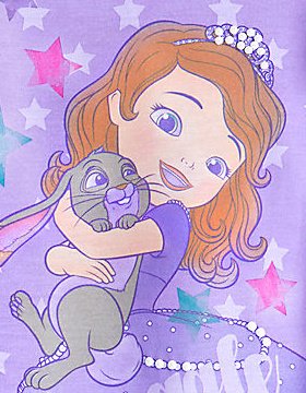 - アメリカ ディズニーストア製。ちいさなプリンセス ソフィア のワンピース型ナイトシャツ。クローバー(ウサギ)を抱いたソフィアのイラスト。袖と裾フリル。後ろ見頃は星の総柄。