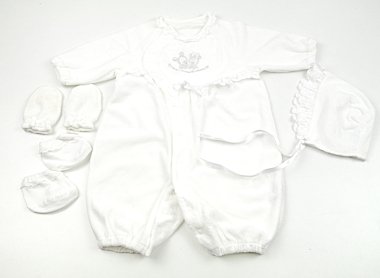 実際のサイズ表記は50-70です。4点セットです。カバーオール所々に黄色いシミあり。ミトンに黄ばみ有り。たくさん必要なベビーサイズ、洗い替え用にいかがでしょうか?