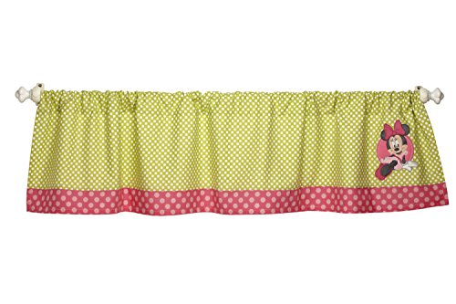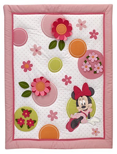 Three-dimensional appliques, cotton rich fabrics, and bright shades of pink and raspberry, accented with touches of green and tangerine - all these deluxe embellishments make Disney's Minnie's Petal Perfect 4pc Crib set extra special;Appliqued Comforter, crib sheet, dust ruffle, appliqued window valance;Comforter 42 x 33, dust ruffle 12 drop, window valance 60 x 14sheets fit standard 28 x 52 crib mattress;Machine wash separately in cold water, gentle cycle; Use only non-chlorine bleach when needed; Tumble dry on low heat; Iron on low heat when neede; Do not dry clean