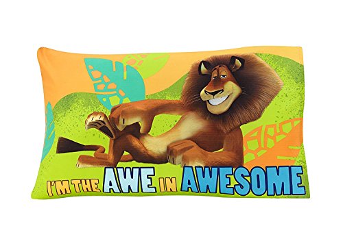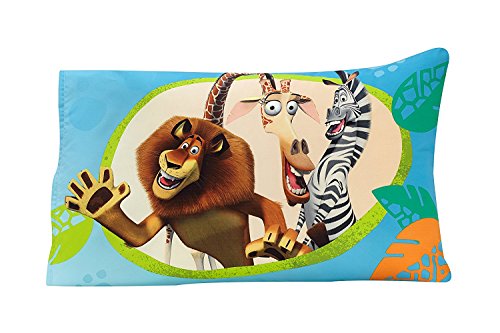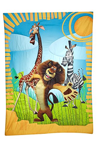 DreamWorks Animation Toddler - Madagascar Behold My Mane 4-Piece Toddler Bed Set. This toddler set includes: quilted bedspread, fitted bottom sheet, flat top sheet and standard size pillowcase. Bring the sunny plains of Madagascar to your toddler's bedroom, complete with wild and crazy Alex, Marty, and Melman! Features a reversible quilt with the trio of furry friends on the front and a geo pattern in blues on the back; fitted sheet with a colorful pattern of safari animals; coordinating blue and white patterned top sheet, and reversible pillow case featuring a lounging Alex and 'I'm the AWE in AWESOME' on one side and the friends bursting out of a jolly jungle scene on the other. Fits a standard size toddler/crib mattress 28' x 52'. Fabric is made of 100% Polyester Microfiber.