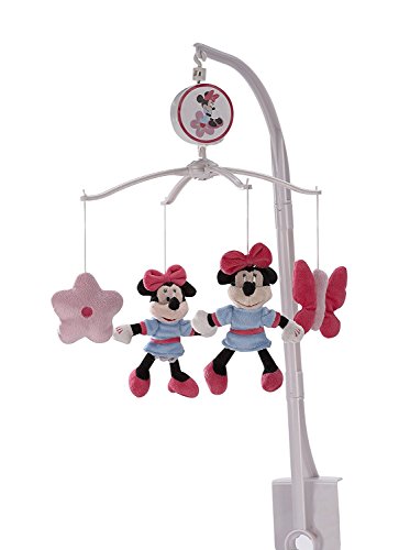 Minnie's Garden Musical Mobile - This musical mobile will help soothe your little one to sleep, gently spins while playing Brahms Lullaby. Features two Minnie Mouse characters, a butterfly, and a flower. Fits most standard and convertible cribs. Coordinates with a full line of Minnie's Garden Nursery Bedding.