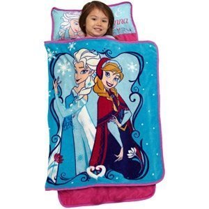 Disney Frozen all-in-one quilted mat, blanket and pillow, Measures 20"x44" including pillow, For travel, slumber parties, daycare, preschool and trips to grandma's, Bold colors with Elsa and Anna graphic design, Rolls up with built in carry handle and "This Belongs To" label for personalizing