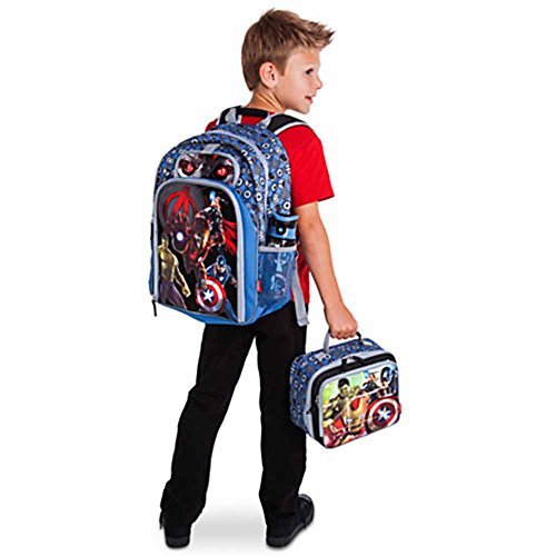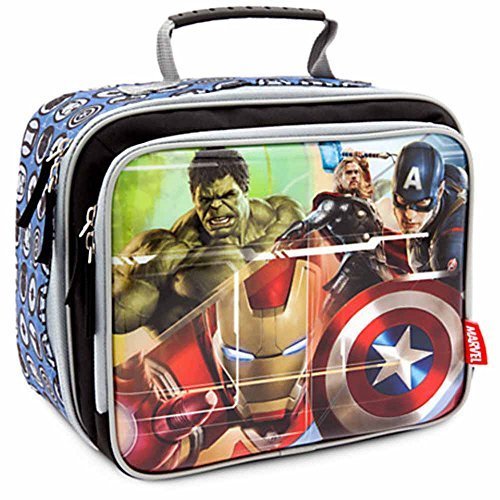 Marvel's Lunch Bag - Thor, Iron Man, Captain America, and Hulk team up on this dynamic lunch tote with artwork inspired by the highly anticipated Marvel's Avengers: Age of Ultron. They'll fight off hunger with the help of their favorite Super Heroes. Marvel's Avengers: Age of Ultron screen art on PVC front Characters include Thor, Hulk, Captain America, Iron Man Exterior front zip compartment with two zip pulls Screen art print on sides Main zip compartment with two zip pulls Food-grade interior lining Insulated interior Interior mesh compartment with self-stick fabric fastener Top handle Interior ID label Ages 3+ All man-made materials; Dimensions - 8"H x 9"W x 5 1/2"D MARVEL BACKPACK IS NOT INCLUDED