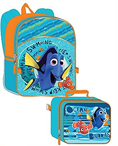 This backpack features characters from most talked about movie of the year, Finding Dory. Dory and Nemo are "Ocean Buddies" who, despite being faced with many deep sea dangers, they "Just Keep Swimming..". This exclusively designed backpack has a detachable lunchbox that is easy to remove/attach for kids of all ages. The backpack has text that says "Just Keep Swimming" and the lunchbox says "Ocean Buddies" It has adjustable shoulder straps for additional comfort. One large zippered compartment for binders, books and, folders, 2 side mesh pouches and a front compartment with zipper closure. This is large 16" school bag made of an easy to clean and very durable polyester. Backpack measures 16" x 12" x 4"